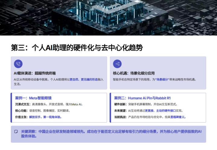 第三个机会:AI个人助理的硬件化与去中心化趋势。我们正在见证AI从手机这一传统终端中解放出来,个人AI助理正在以更自然、更无缝的方式融入到我们的日常生活中。比如Meta的智能眼镜,它解放了双手,用户可以通过第一视角与设备进行交互,完成很多原本需要手机操作的任务。