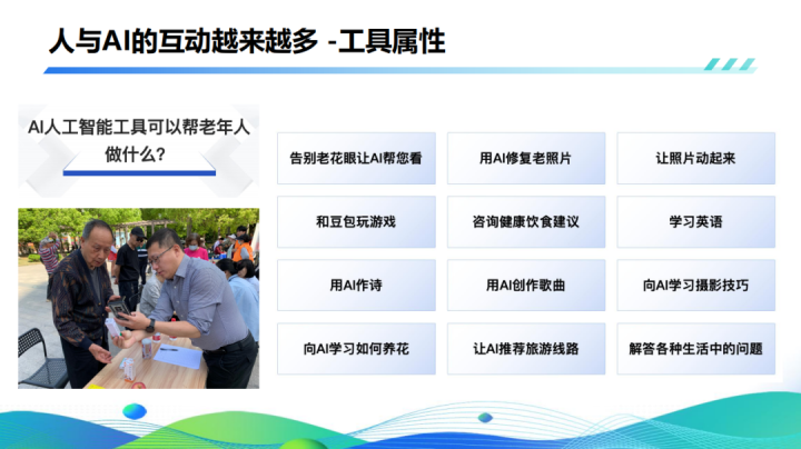 老年人与AI的互动,目前已经成为一个不断发展的领域。虽然老年人在技术接受度上可能较低,但随着数字鸿沟逐步缩小,AI技术已经开始进入老年人的生活,带来一些切实的帮助。AI可以作为工具来辅助老年人,也可以提供情感陪伴、生活服务等功能,比如帮助老年人看清楚小字体、拍照解读文字、修复和活化老照片等。