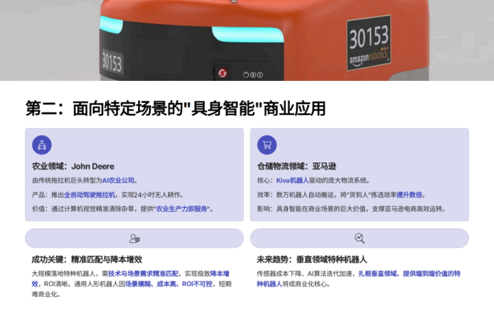 第二个机会:面向特定场景的“具身智能商业”应用。通用的人形机器人由于场景模糊、成本高、投资回报周期长,短期内是很难实现商业化的。真正的机会在于垂直领域的特种机器人,例如农业领域的John Deere公司,它从传统的拖拉机制造商转型为AI农业公司,推出的全自动拖拉机能够24小时无人耕作,通过计算机视觉精准清除杂草,极大地解放了农民的劳动力。