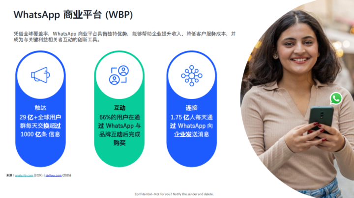 Whatsapp是目前增长最快的业务渠道之一,我们参与了很多市场活动,听到最多的反馈就是:是否支持Whatsapp消息?在这里,我们提供的是Whatsapp的商业平台服务。通过Whatsapp,企业能够触达全球29亿用户,提供更具互动性的服务。