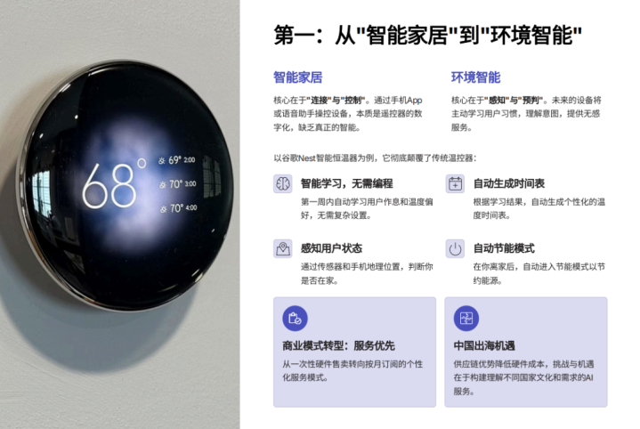 以谷歌Nest智能恒温器为例,它能够自动学习用户的作息温度偏好,并生成个性化的时间表。离家后,它会自动进入节能模式,这才是真正的智能。对于中国出海企业而言,我们的供应链优势能够帮助我们将智能硬件成本降到最低,但挑战和机遇在于,我们能否构建出能够理解不同国家用户文化和生活需求的AI服务。只有这样,我们才能为用户提供高价值的服务。